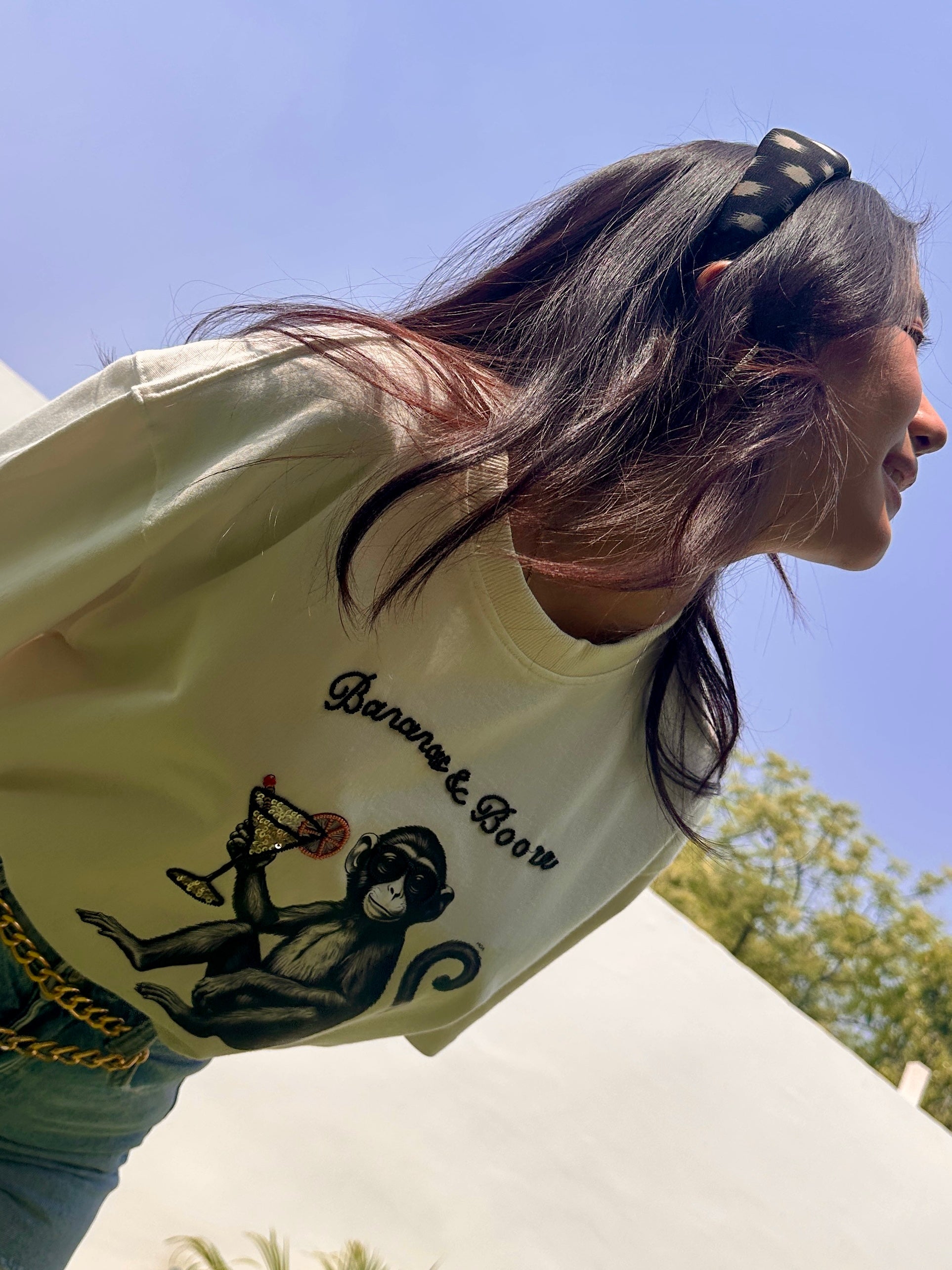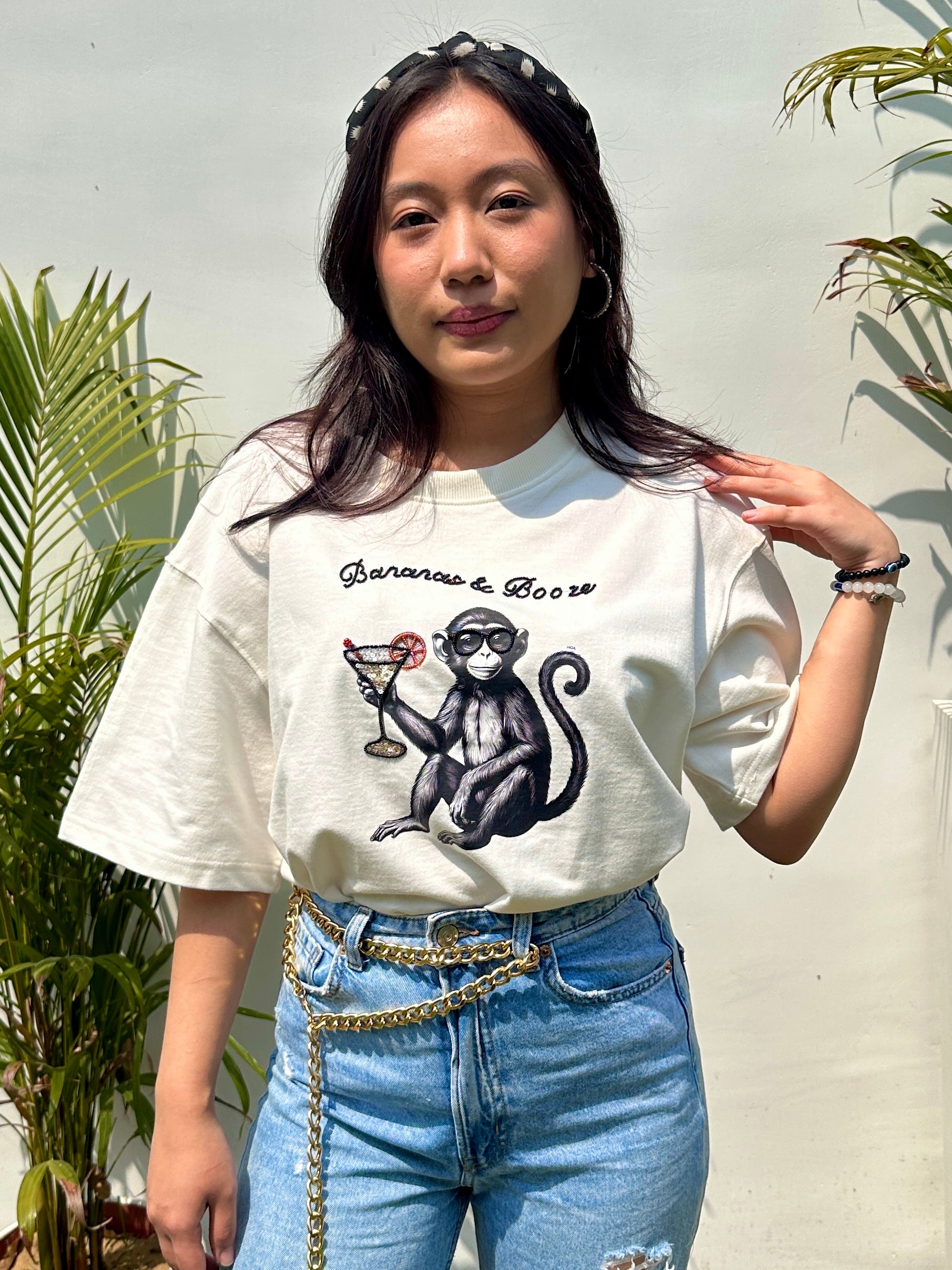 Playful, bold, and a little bit tipsy — just like your weekend mood. Featuring an embroidered monkey graphic with the text “Banana & Booze,” this tee is for the girl who knows how to keep it fun (and fruity). Designed in our signature oversized fit with soft, breathable cotton — it’s a whole vibe, whether you’re out with the gang or nursing a mimosa at brunch.