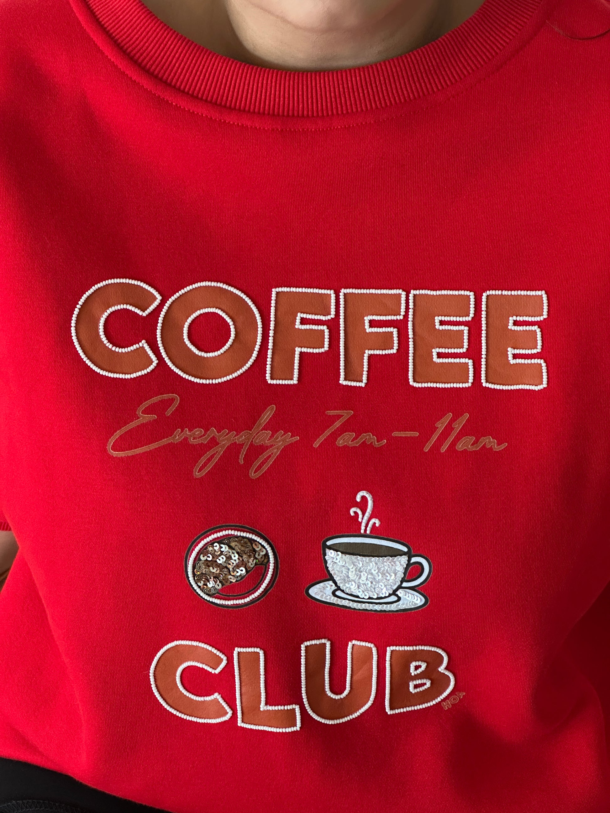 This rich red Coffee Club sweatshirt brings all the cozy café vibes with a playful graphic that celebrates slow mornings, warm mugs, and your daily dose of happiness. The colour adds a little spice, while the comfy fit keeps things soft, snuggly, and oh-so-wearable.