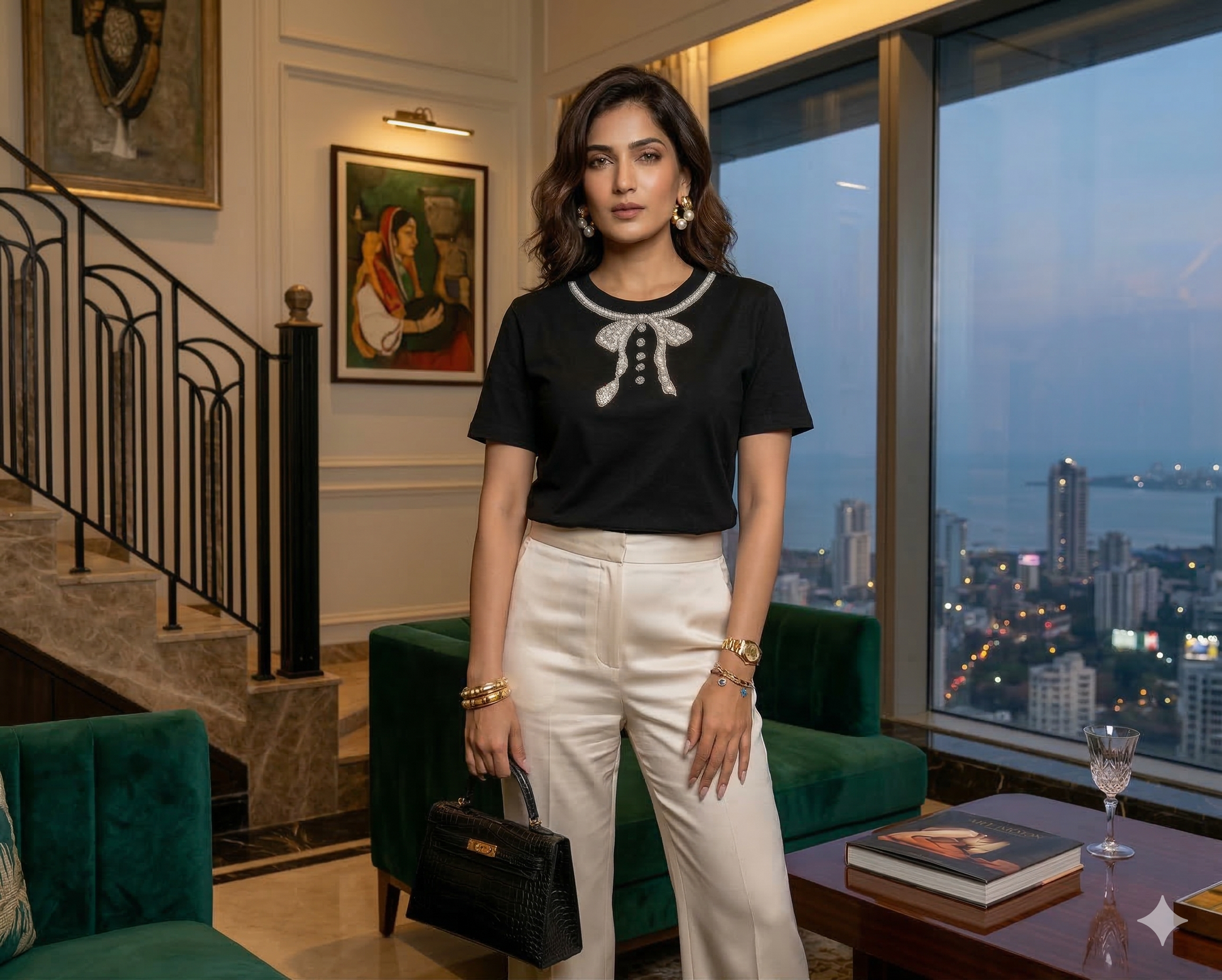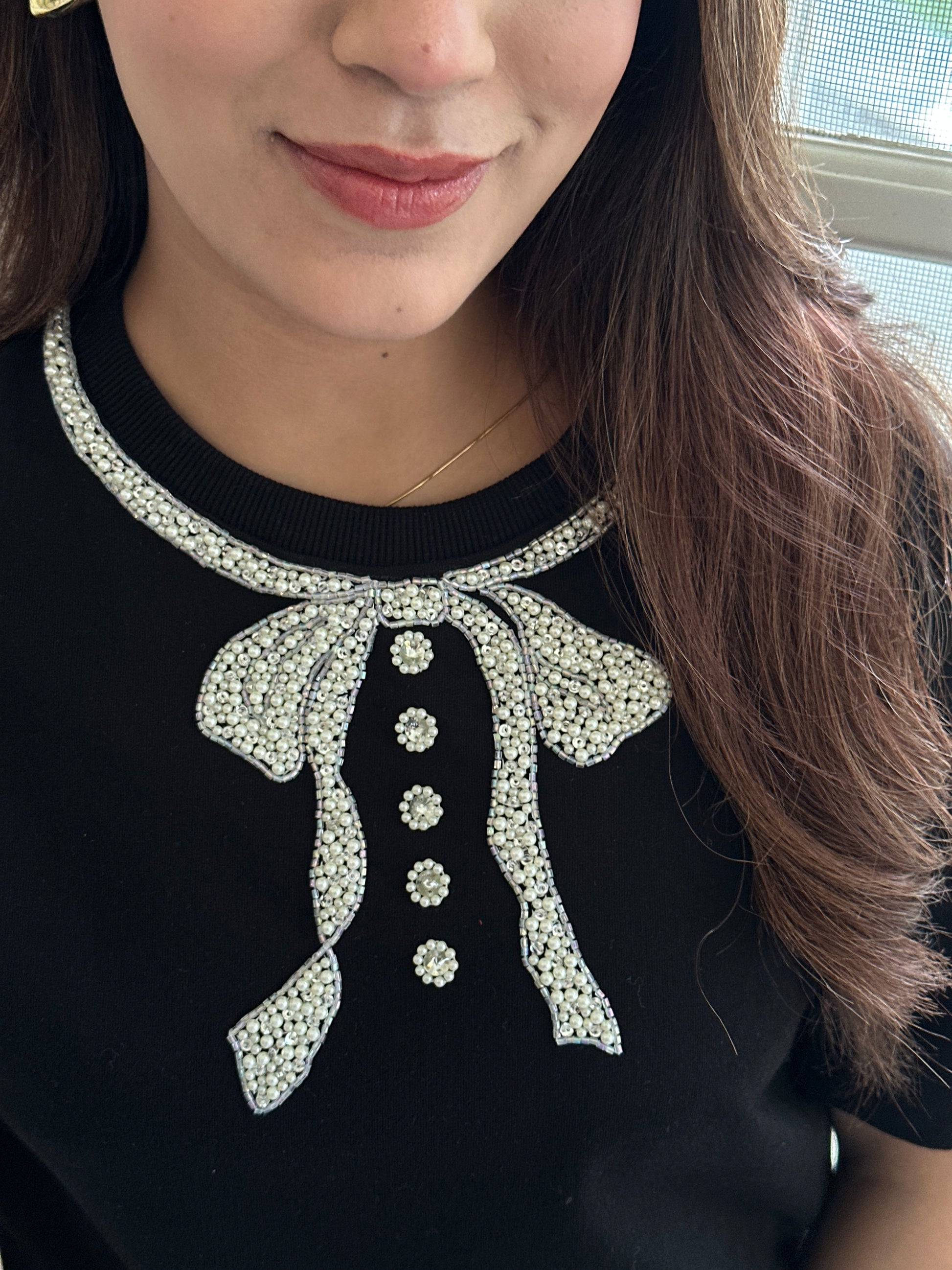Crafted in rich black premium cotton, the Noir Bow Luxe Tee is adorned with an intricately embellished crystal bow neckline that instantly elevates your look. The delicate sparkle catches the light beautifully — refined, feminine, and unapologetically elegant.