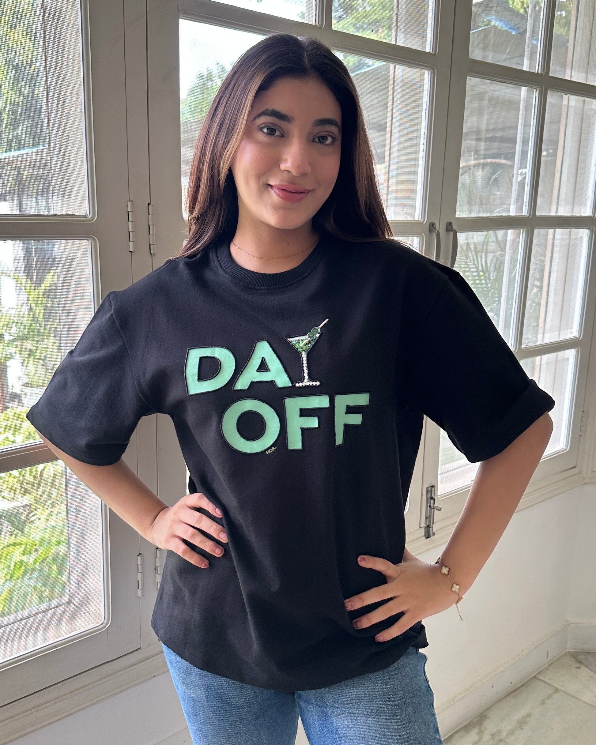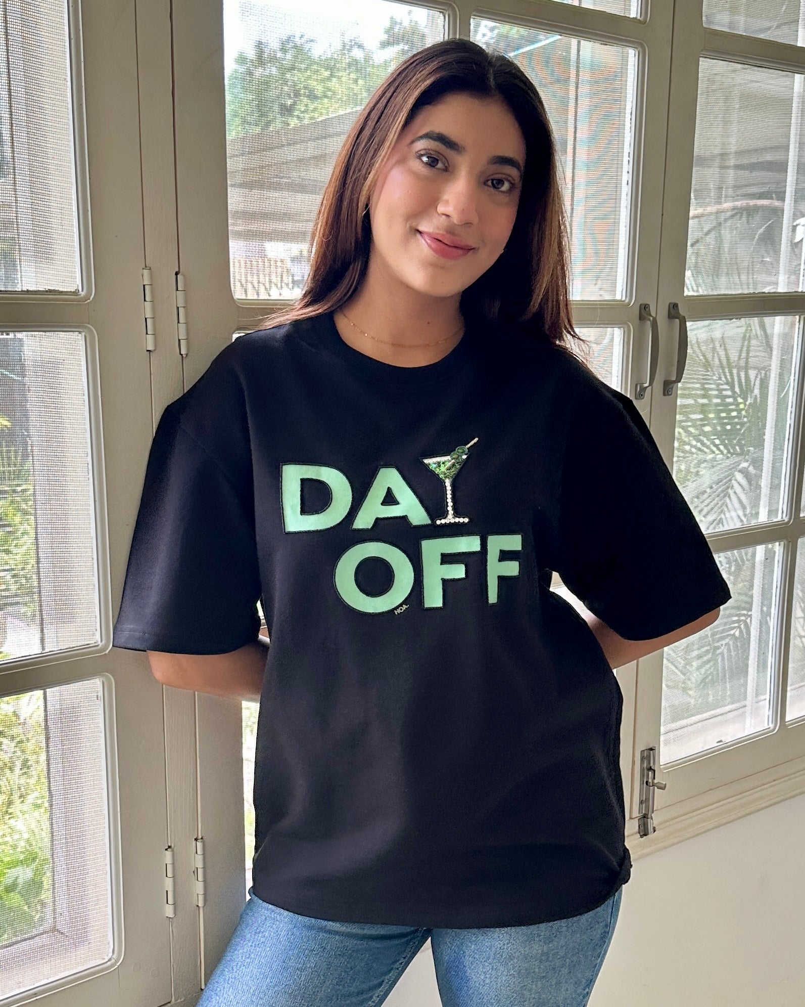 Your ultimate off-duty essential. The Day Off Tee in black is elevated with a chic martini glass graphic, bringing just the right mix of luxe and laid-back. Sleek, versatile, and unapologetically stylish, perfect for pairing with denim, skirts, or even tailoring when you want that playful edge.
