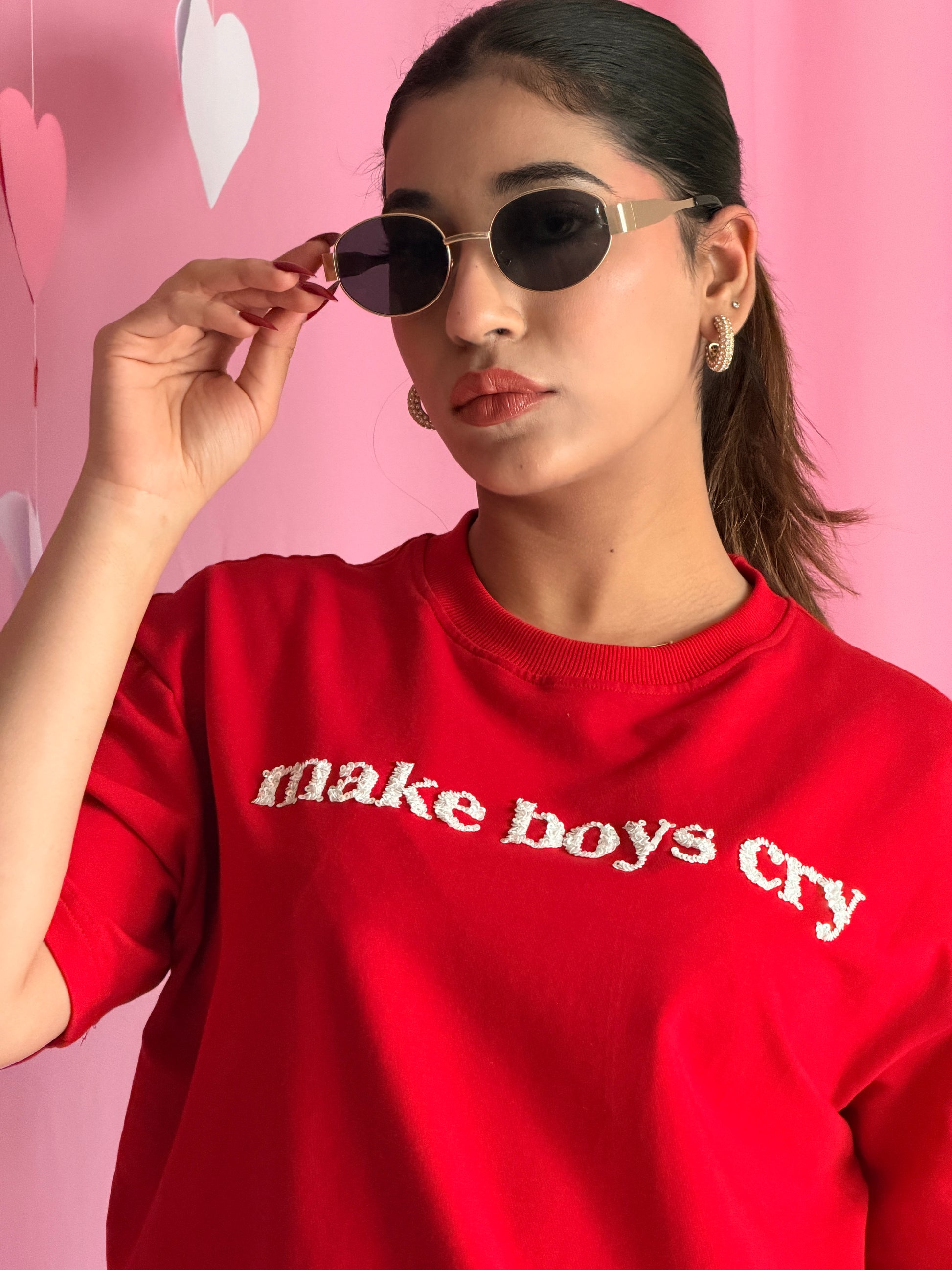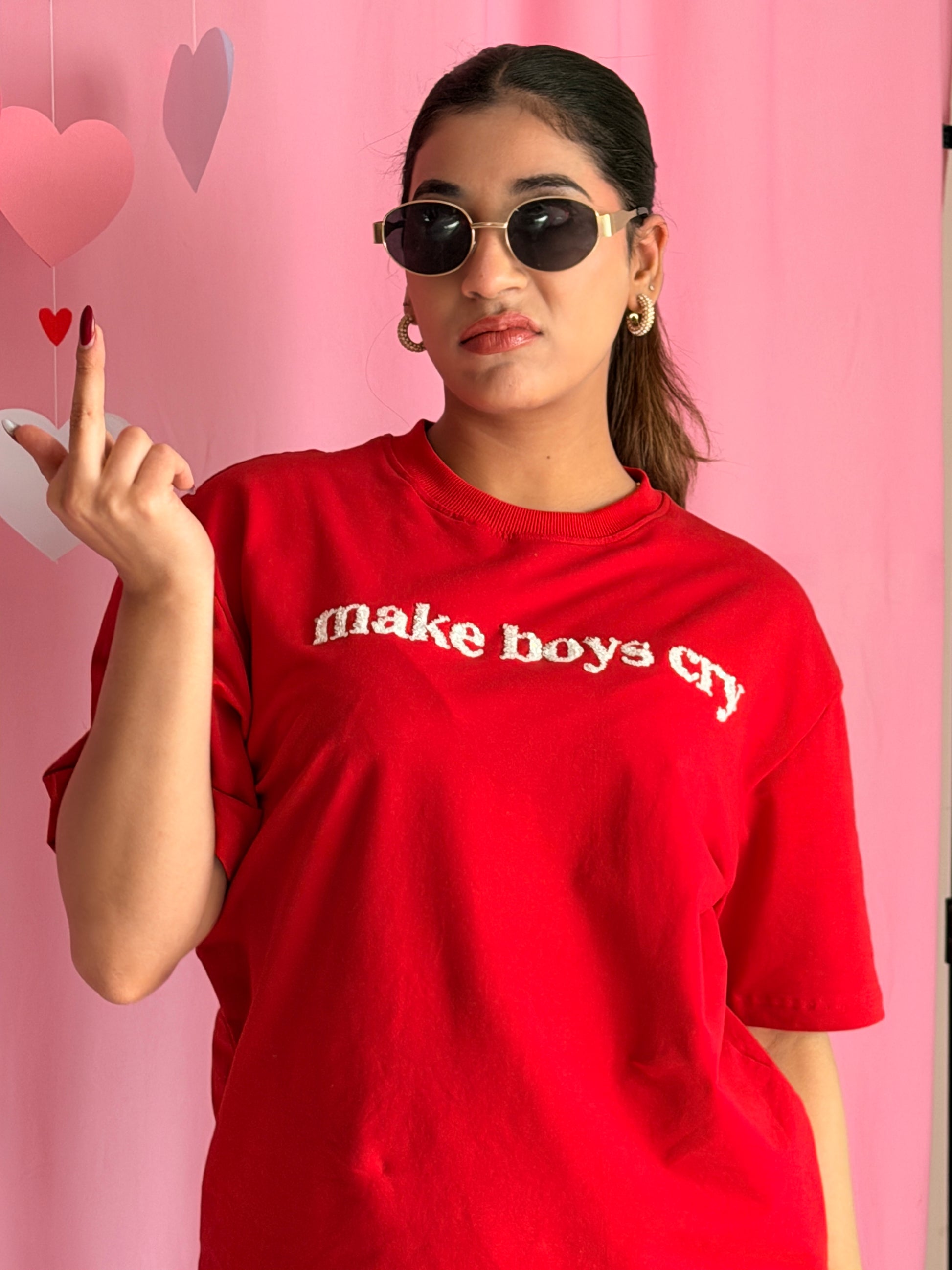 Not mean. Just unforgettable. Featuring the iconic make boys cry text, this tee is equal parts playful and powerful. Perfect for Valentine’s Week when you’re choosing self-love, sass, and style—always in that order.