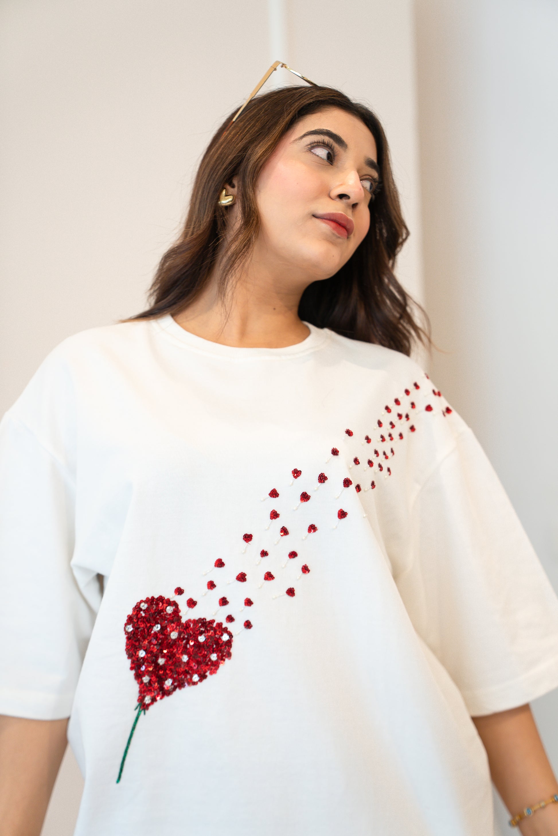 Meet the Love Bloom Tee — a crisp white oversized fit brought to life with a blooming heart of hand-embellished red crystals. It’s giving “wear your heart out loud” energy, playful, radiant, and unapologetically soft. The scattered heart crystals flow from the front like love in motion, making this piece perfect for date nights, girl brunches, or just feeling extra cute on a random Tuesday.