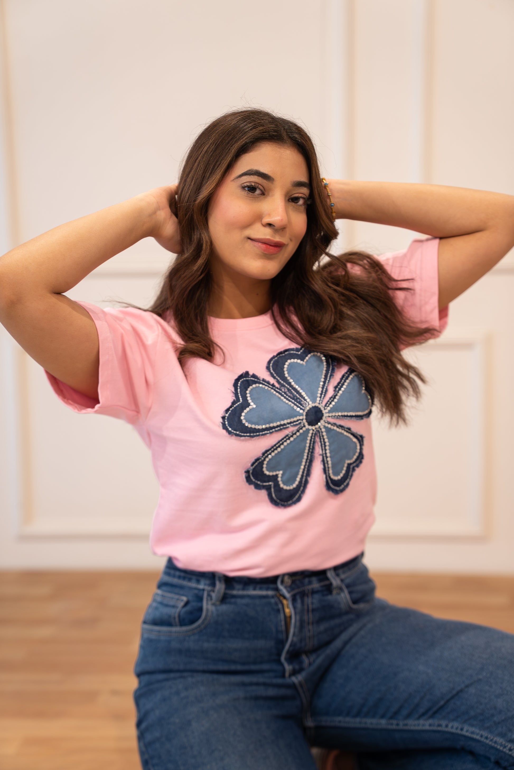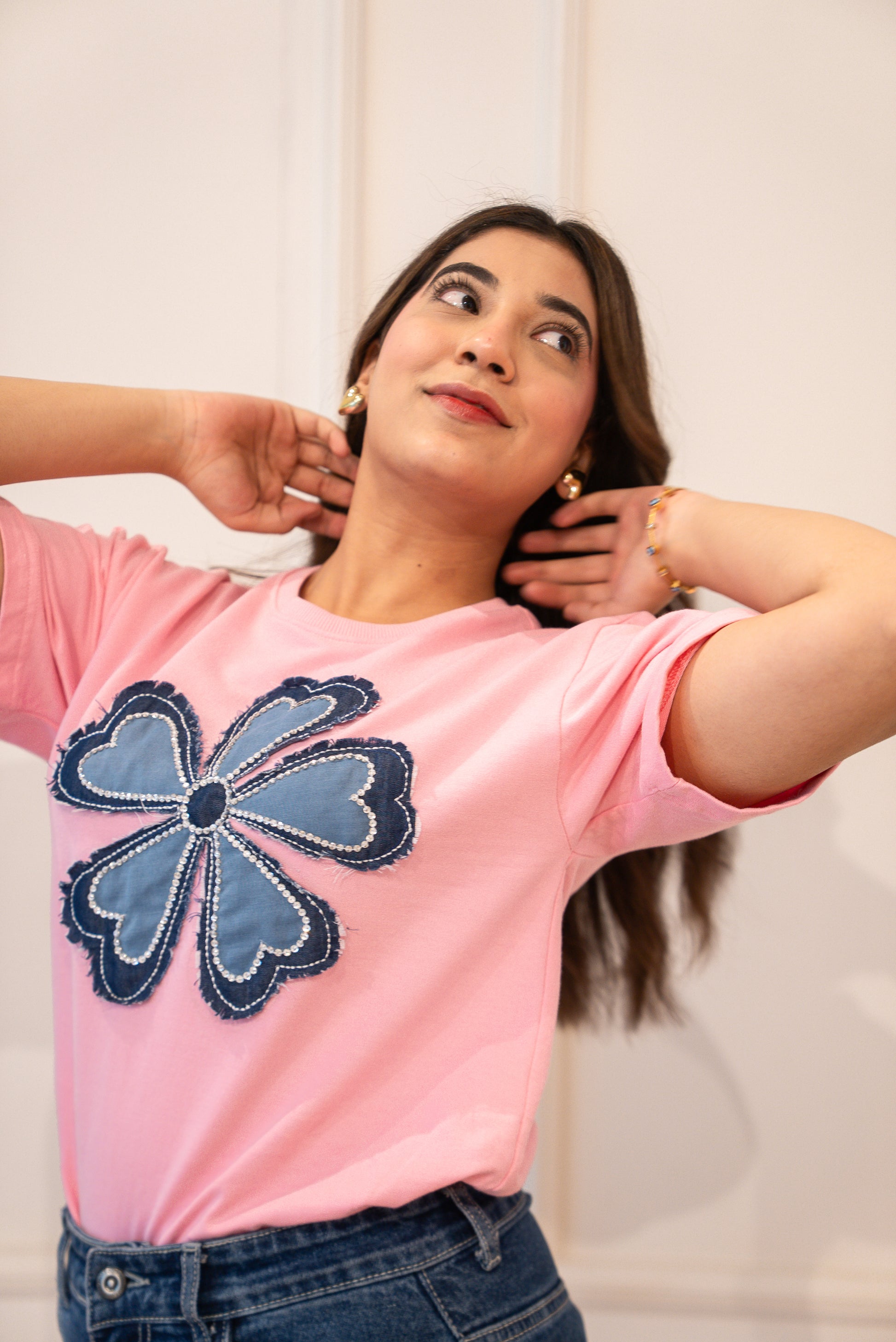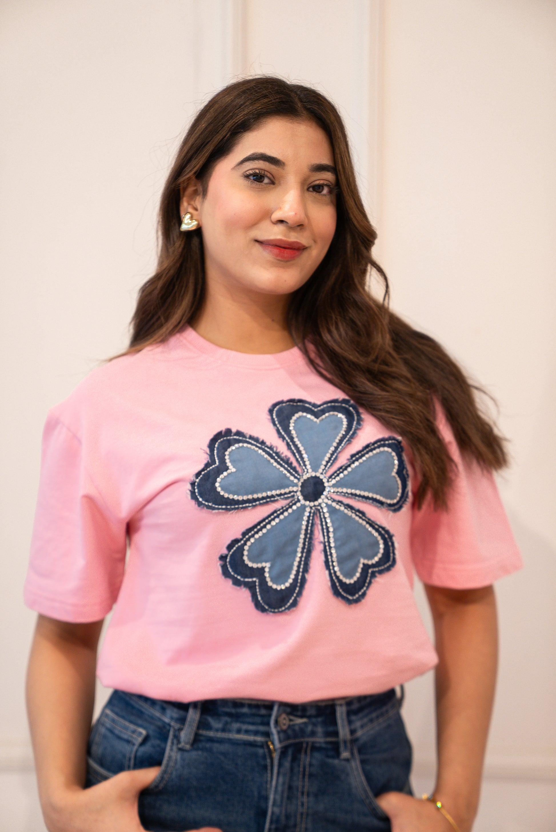 Because good energy deserves a cute outfit. This candy pink oversized tee is your lucky charm — featuring a hand-appliquéd flower made entirely of denim hearts, outlined with sparkly pearls for that extra feminine magic. It's bold, playful, and just the right mix of soft and statement.