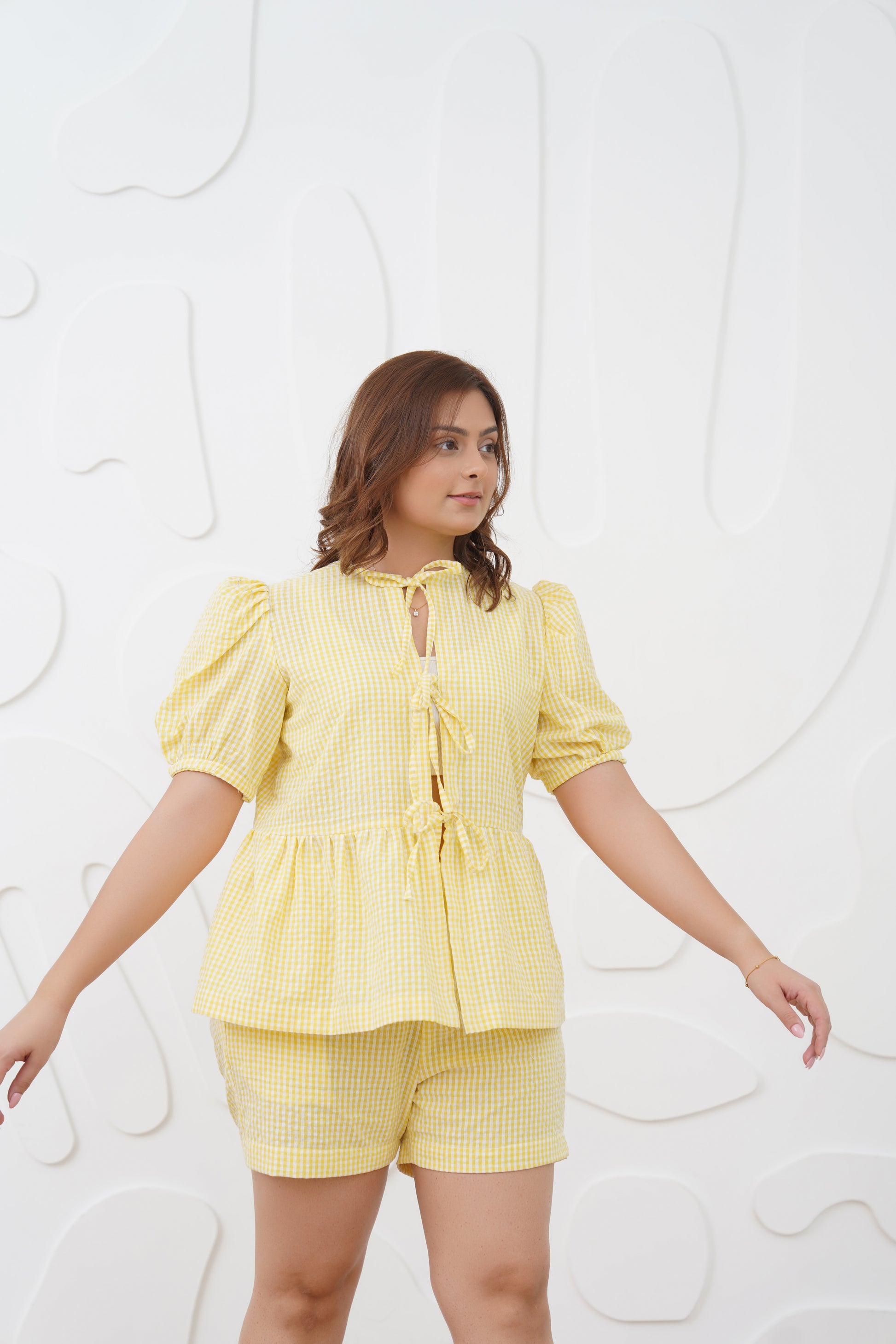 A charming gingham co-ord that brings a playful yet sophisticated touch to your wardrobe. With its bow tie peplum top and high-waisted shorts, this set is the perfect pick for your next brunch date or sunny day out.