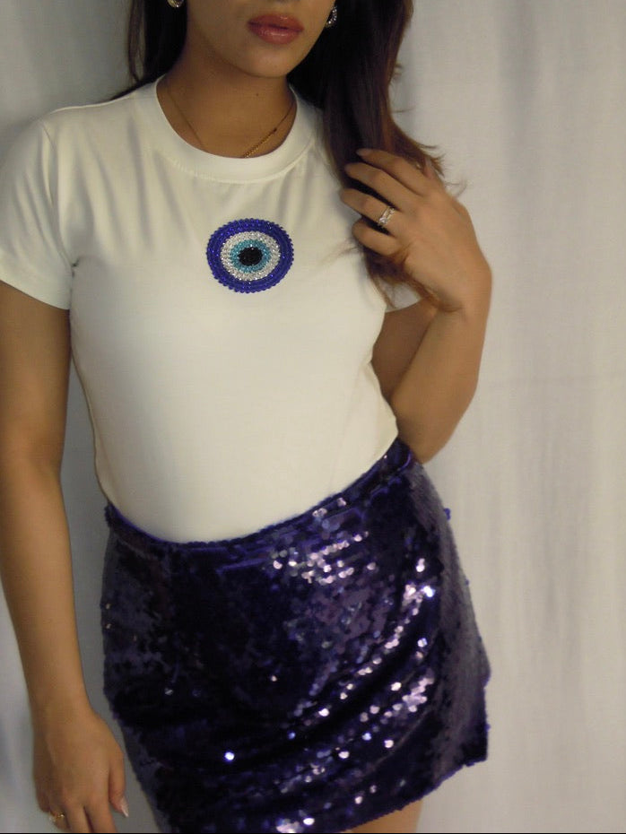 The Blue Evil Eye Sculpted Tee is crafted in our signature buttery-soft, sculpting fabric that hugs you in all the right places. Featuring a delicate evil eye detail, it blends style with a hint of energy—because your outfit should look good and keep the vibes right.