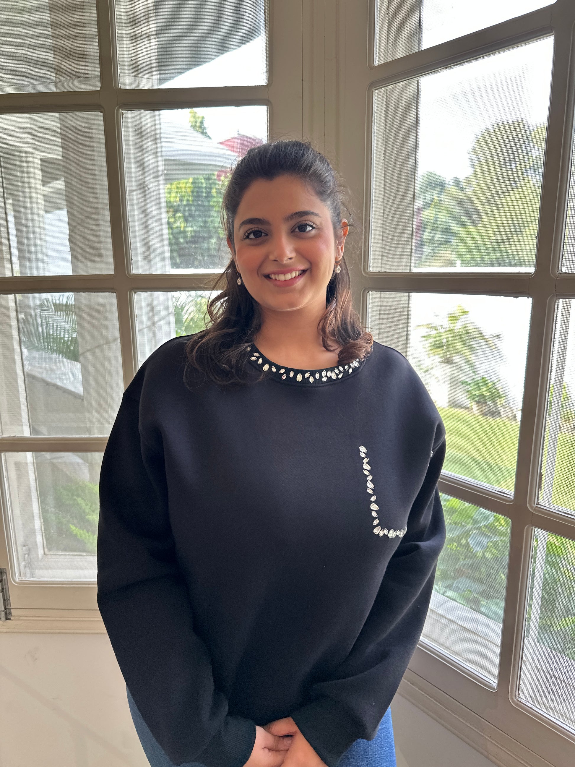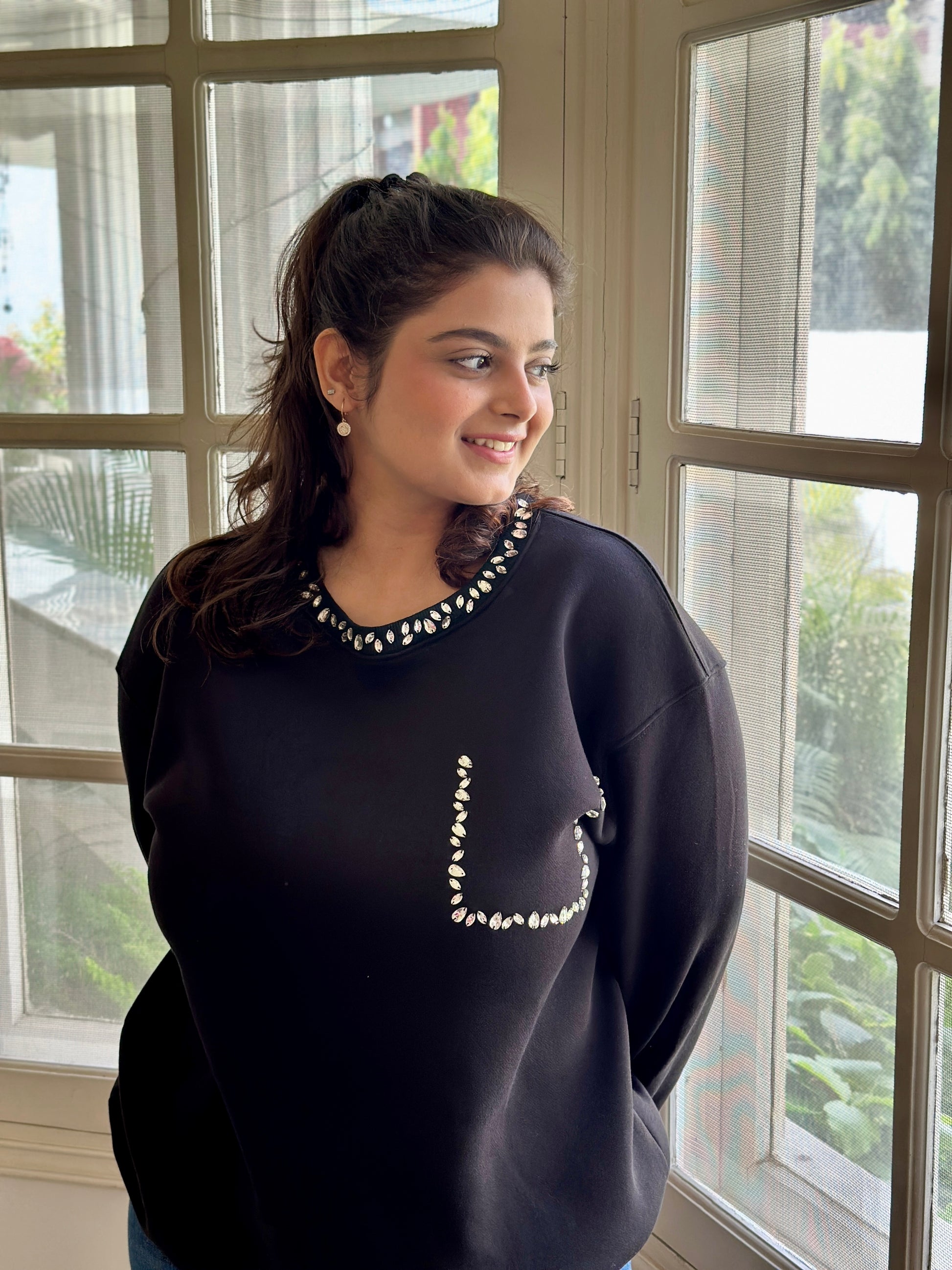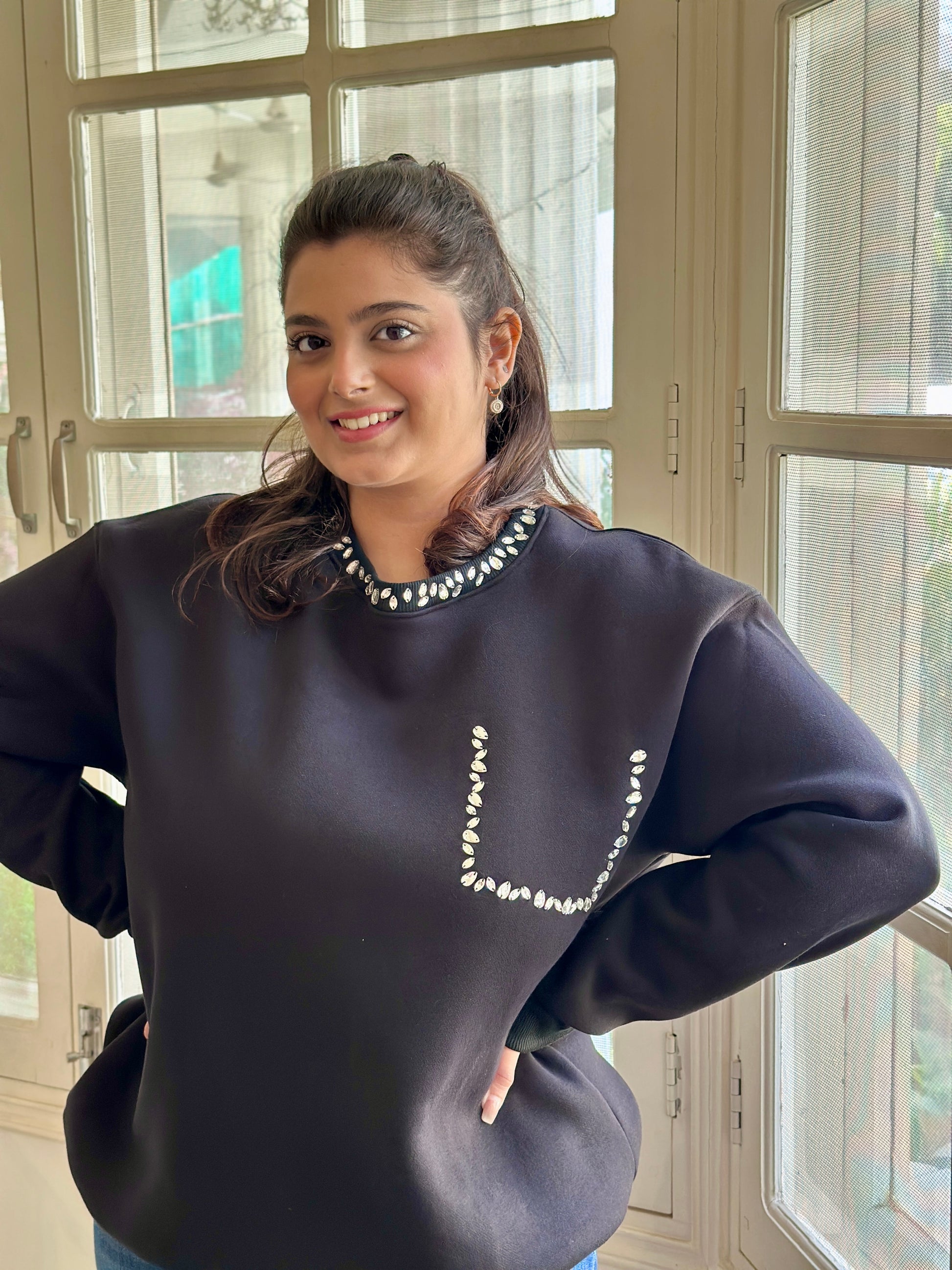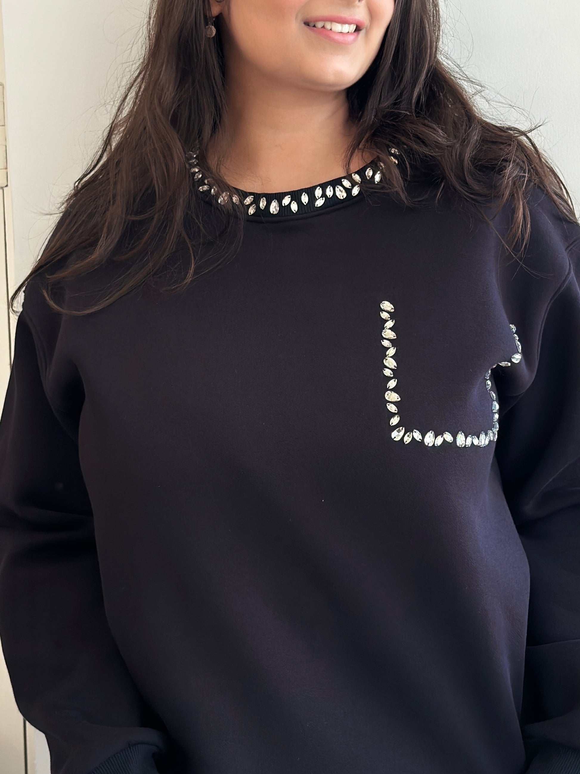 A statement sweatshirt that redefines casual luxe. Designed with a hand-embellished stone neck that adds just the right amount of sparkle and a faux pocket for that playful twist. It’s comfort meeting couture — perfect for cozy brunches, travel days, or when you want to look put-together without trying too hard. ✨