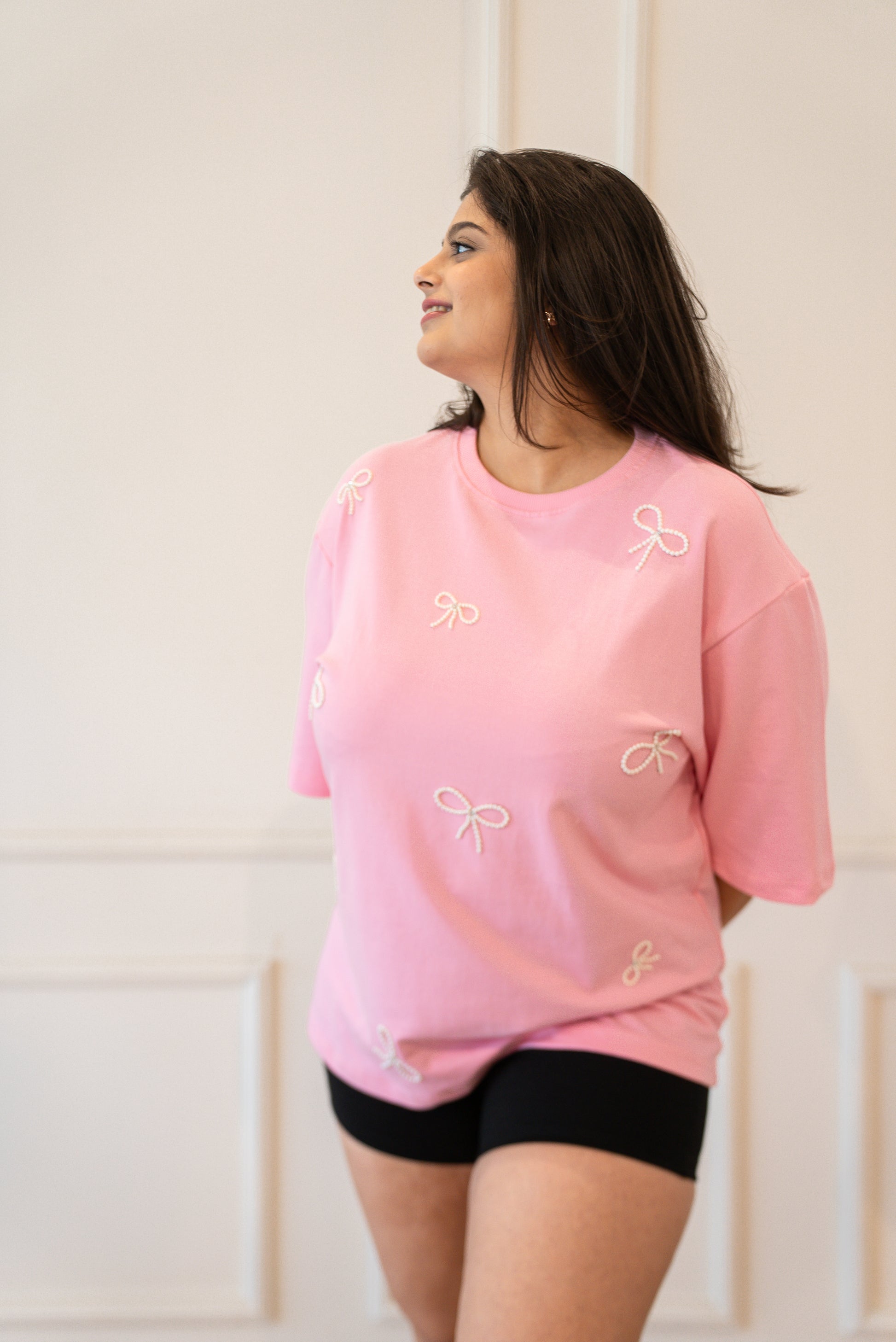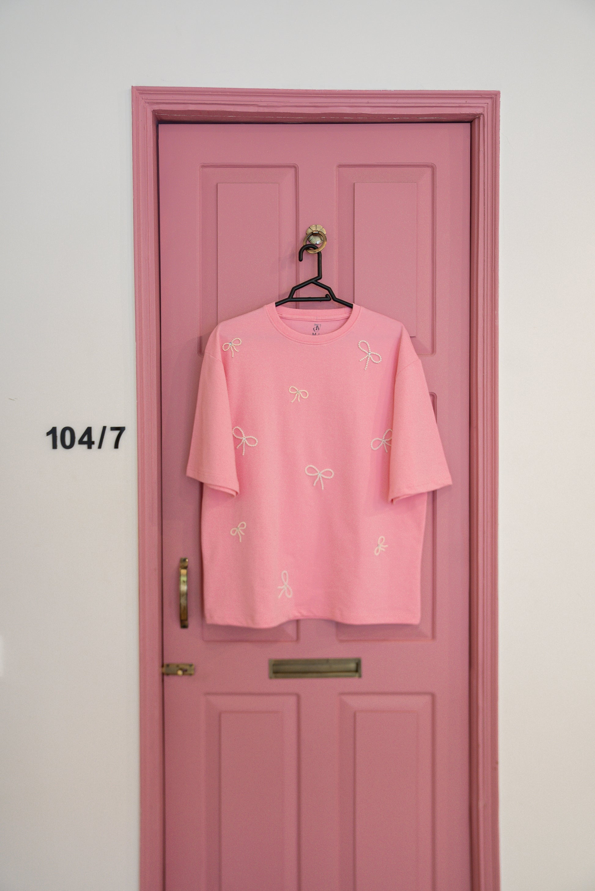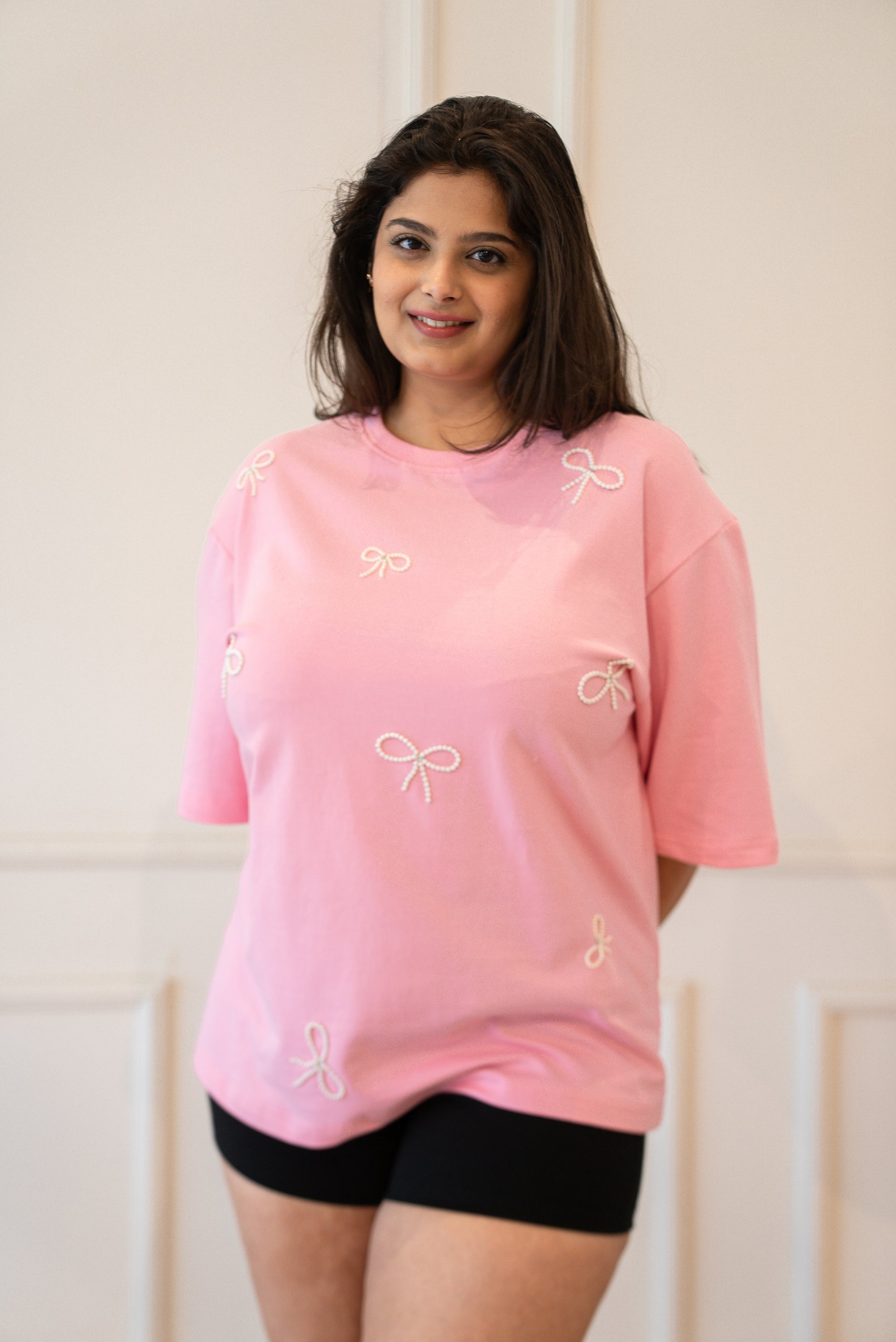 A soft pink dream for the girl who lives in bows and blush tones. This oversized tee is dotted with delicate pearl bows, handembroidered by hand to give you that dreamy, coquette-core look without trying too hard.