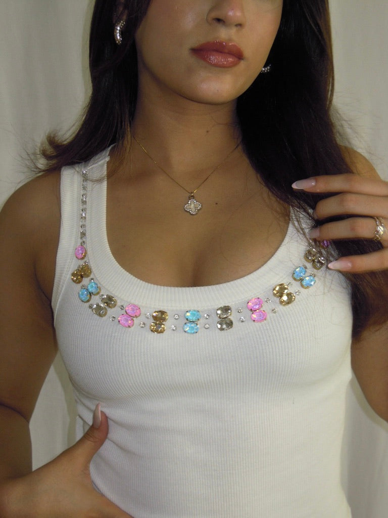 A classic white tank—elevated with delicate pastel embellishments that catch the light just right. It’s giving effortless polish with a hint of play, perfect for days that turn into plans. Paired with a shimmer moment below, because subtle was never the agenda.