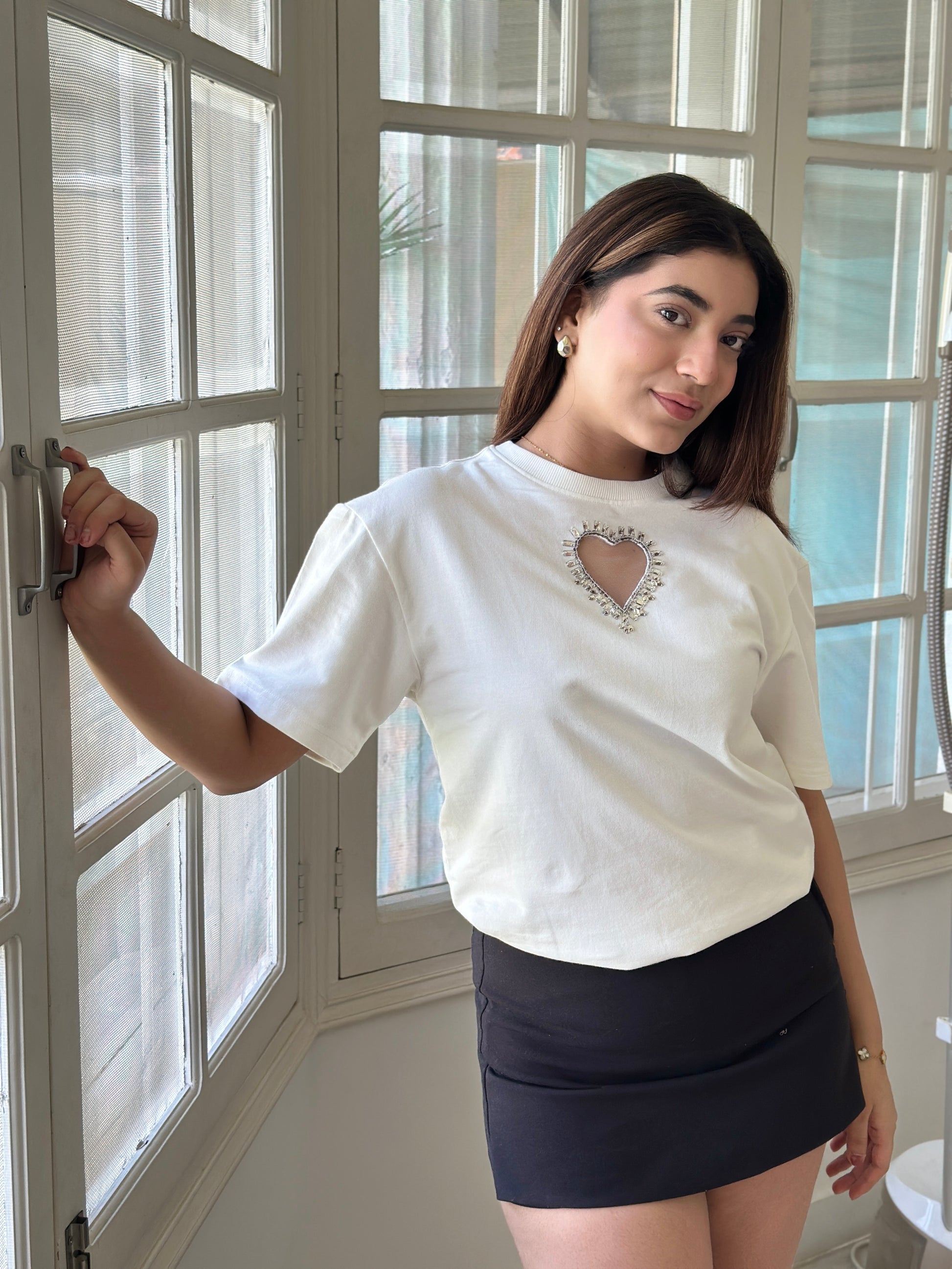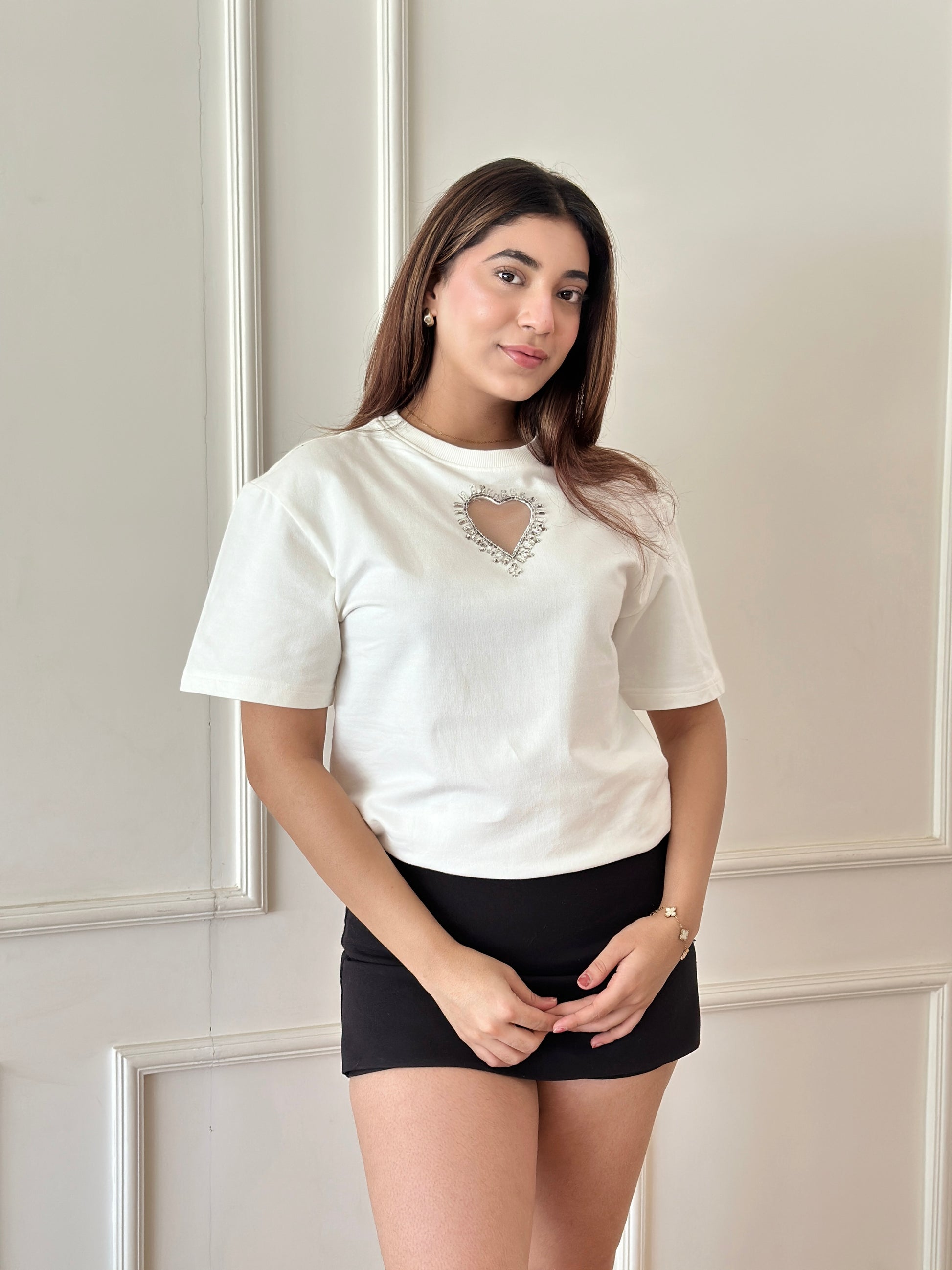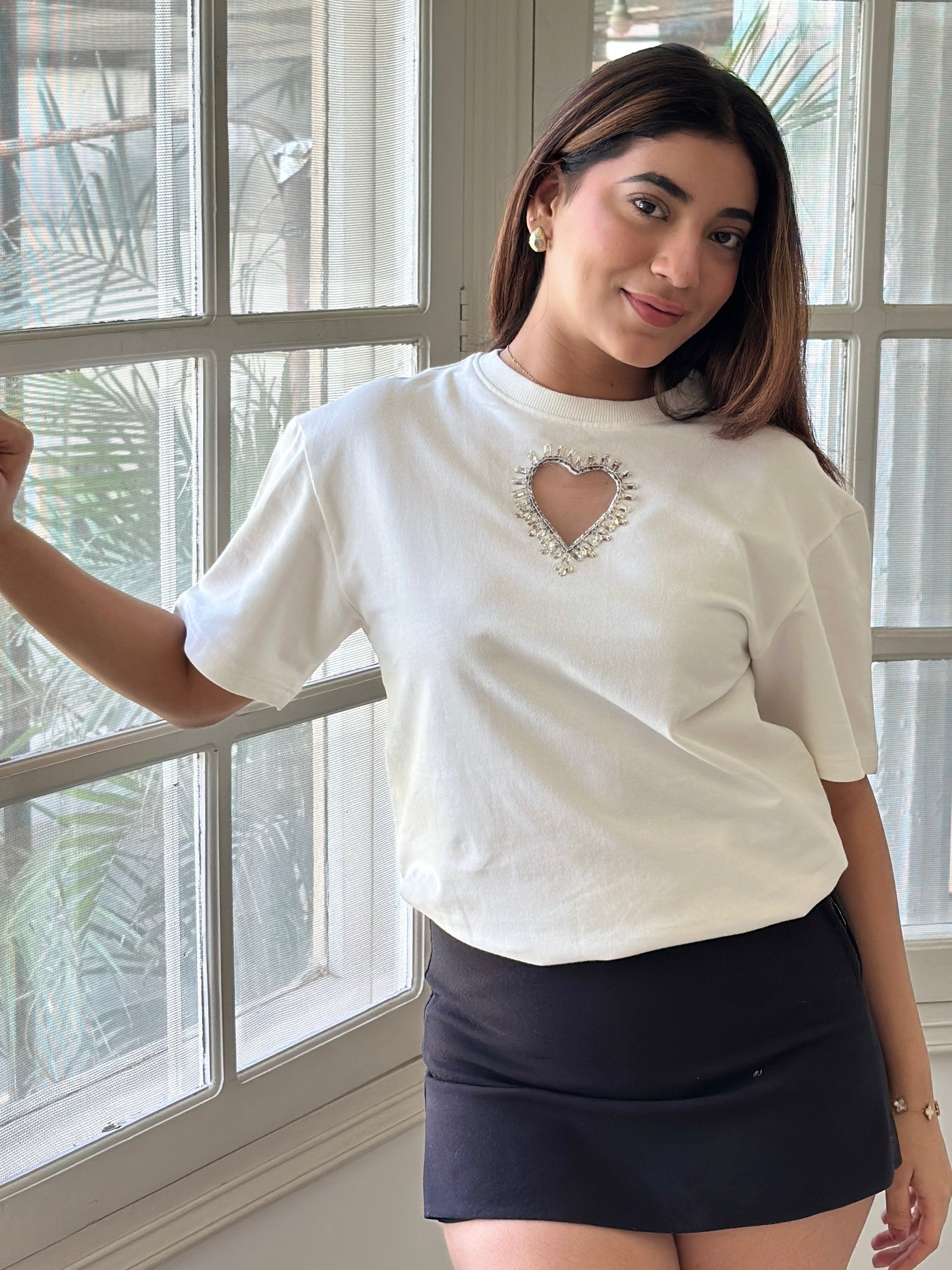 A statement-making tee that blends luxe and playful, crafted with a chic centre cut-out outlined in crystals and finished with a delicate net. Dress it up for a night out or style it down for effortless glam.
