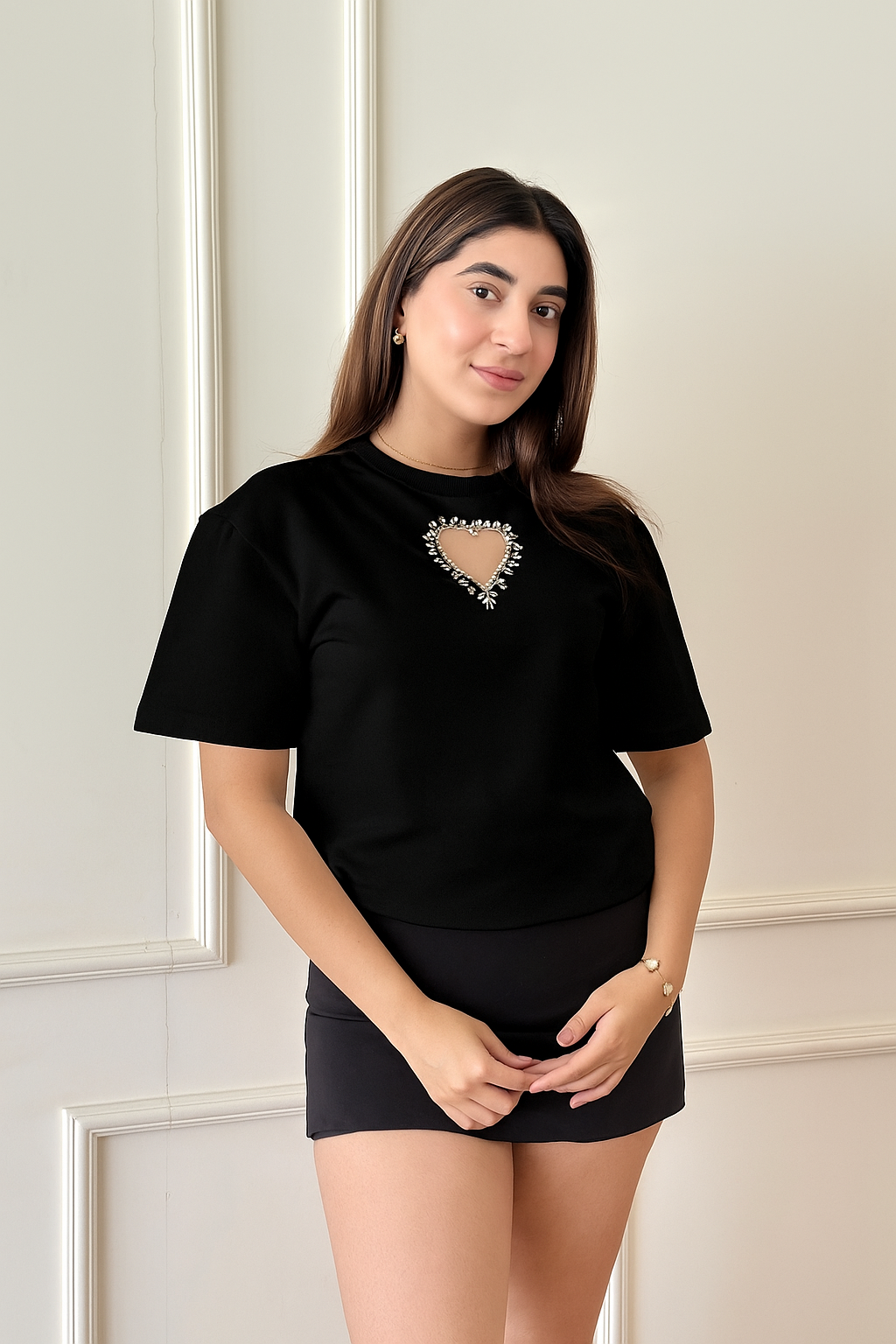 A statement-making tee that blends luxe and playful, crafted with a chic centre cut-out outlined in crystals and finished with a delicate net. Dress it up for a night out or style it down for effortless glam.