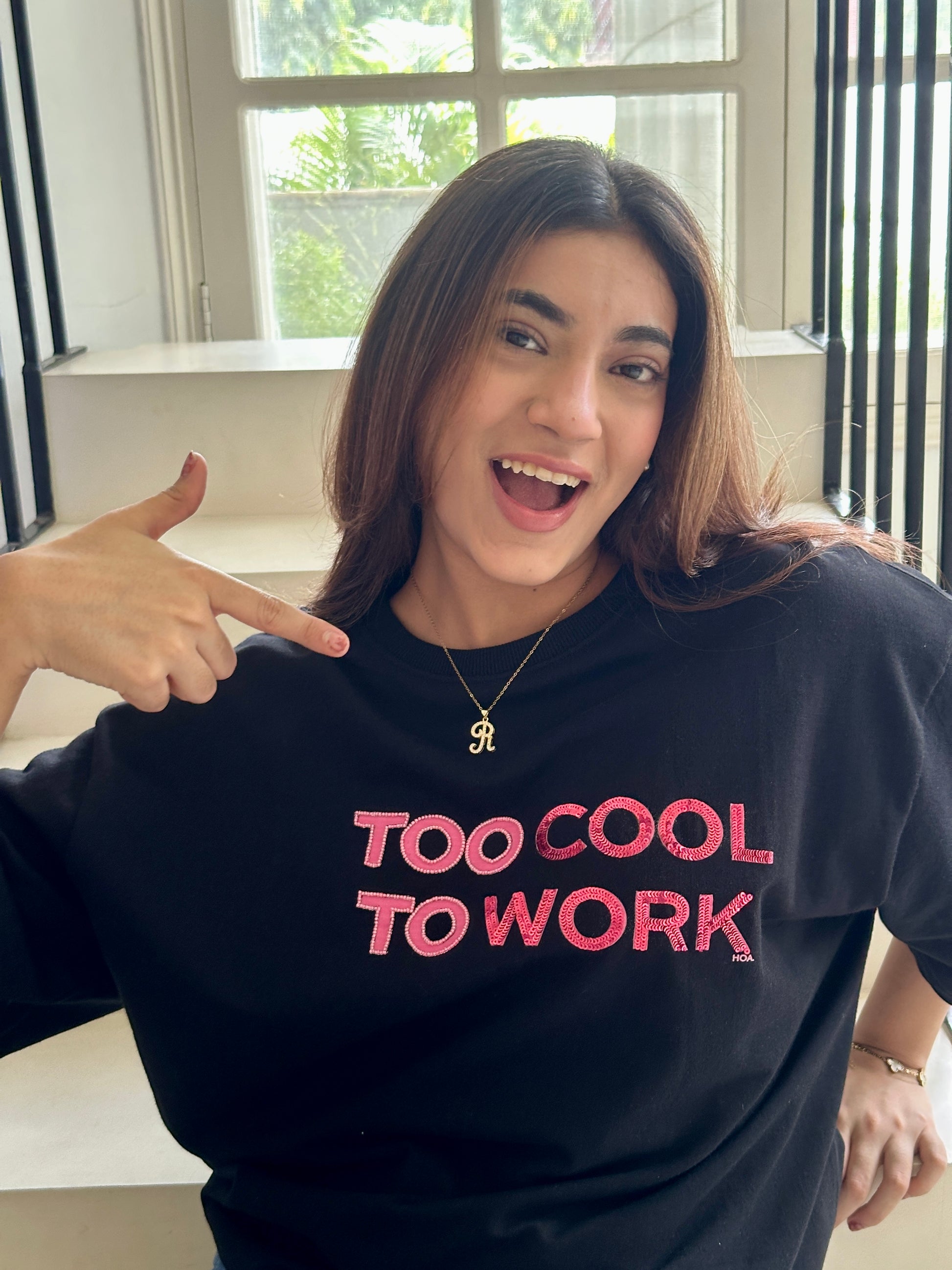 The Too Cool Tee in black is your unapologetic style statement. With Too Cool to Work splashed across in a playful pink, this oversized tee brings together bold attitude and luxe comfort. It’s the perfect mix of sass and chic, made for days when you’d rather own the vibe than follow the rules.
